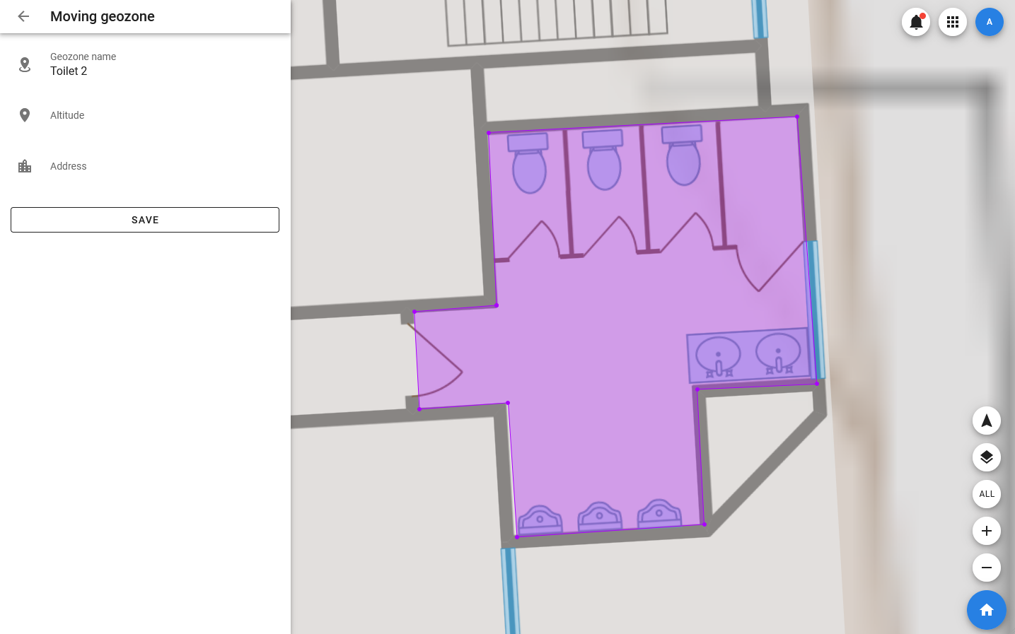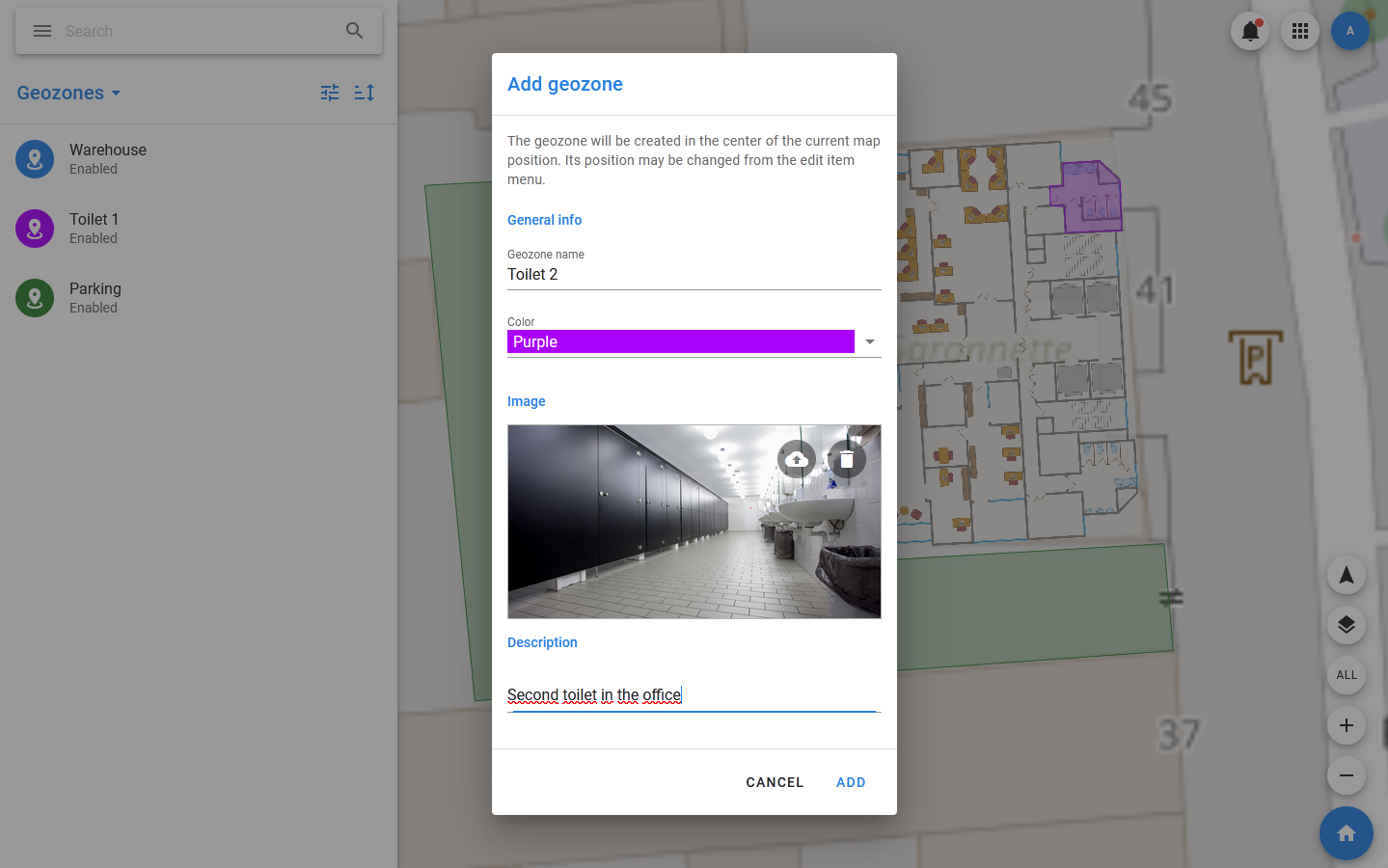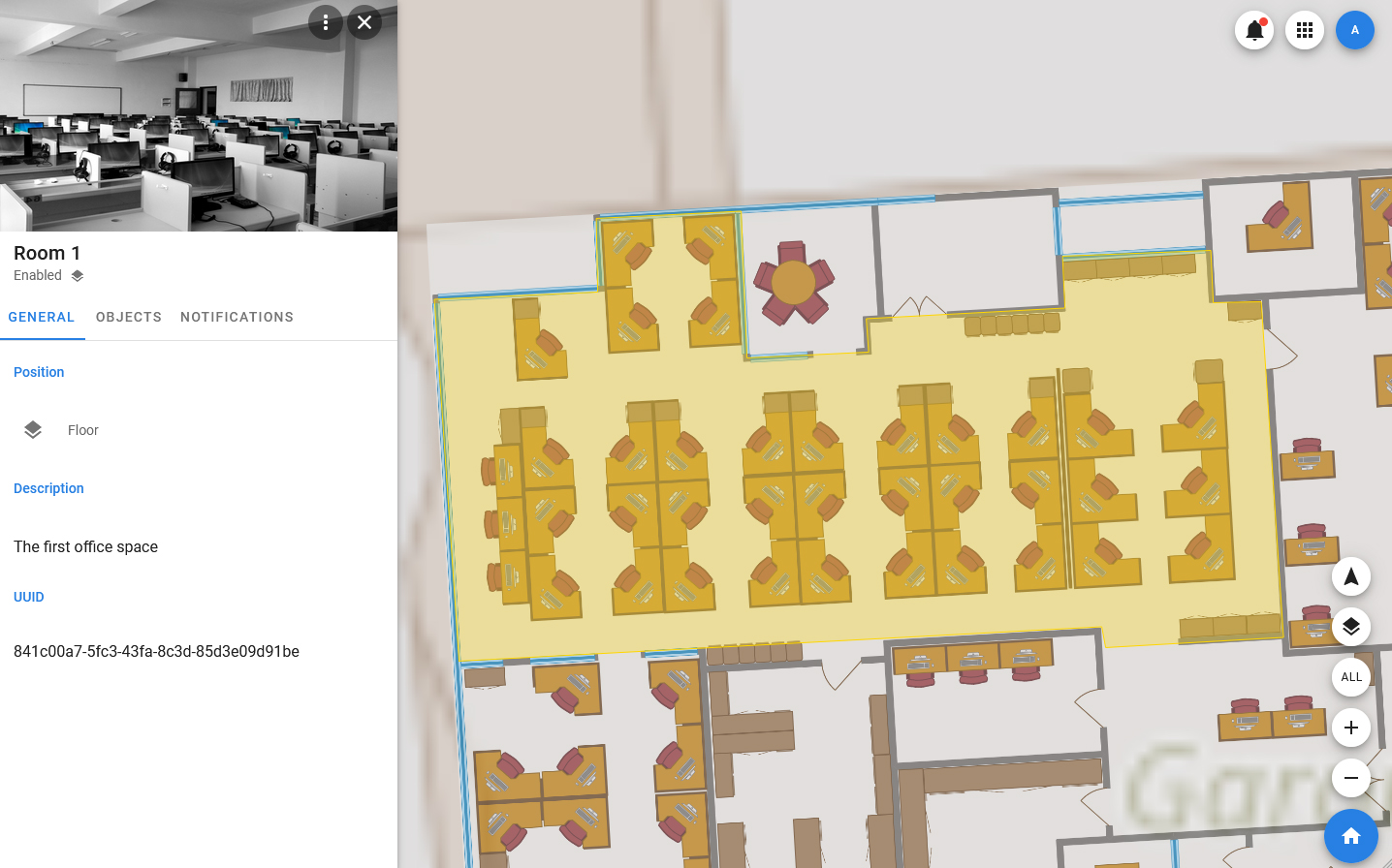 Geozones are primarily designed to track the geographical position of objects (their approach and distance from certain zones on the map), but they also have additional functionality. The geozone can be linked to room plans displayed on top of the map, and images that simplify the relationship between real objects and objects on the map.